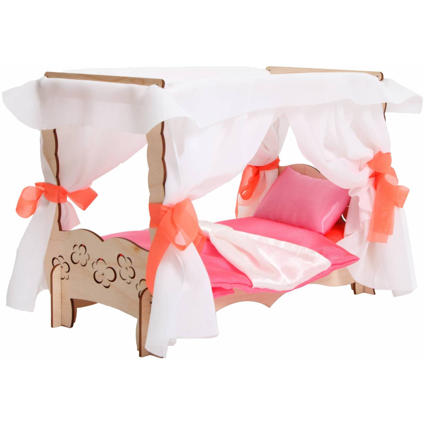 С помощью данного конструктора можно собрать кровать с шикарным балдахином для куклы Барби, изготовленный мастерами вручную. Наборы комплектуются текстильными элементами - постельными принадлежностями ярких расцветок (подушка - 1шт., матрас - 1 шт., одеяло – 1шт.). При сборке не используется клей. Детали стыкуются с помощью пазов и отверстий.
