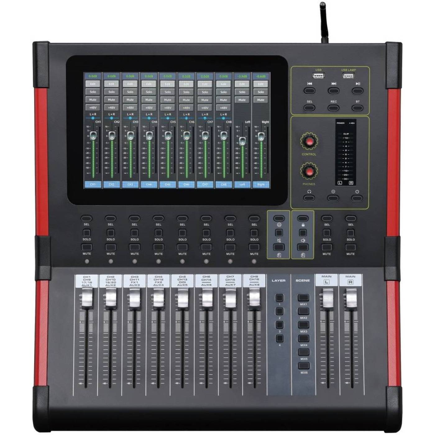 Гибкость слоев: включает в себя два главных фейдера LR, 8 фейдеров каналов и 4 слоя фейдеров для быстрого переключения между группами каналов (например, CH1-8, CH9-16, AUX, FX).