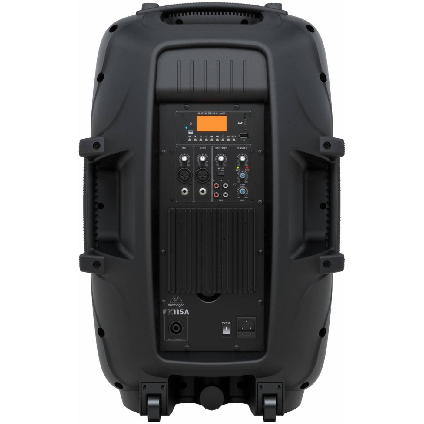 BEHRINGER PK115A - ультракомпактная, двухполосная, активная акустическая система, с 15 ' НЧ вуфером с увеличенным ходом звуковой катушки и 1' компрессионным ВЧ твитером. На задней панели встроенный медиаплеер с дисплеем, слотом для SD-карты, USB-портом и приемником Bluetooth. 2-х канальный микшер с отдельными микрофонными / линейными входами, регуляторами громкости и светодиодами перегрузки.2-х полосный эквалайзер и встроенный DSP для максимального контроля и защиты динамиков от перегрузки. Сверхширокая дисперсия, широкоформатный экспоненциальный рупор. Линейный выход на задней панели усилителя позволяет подключать дополнительные акустические системы.