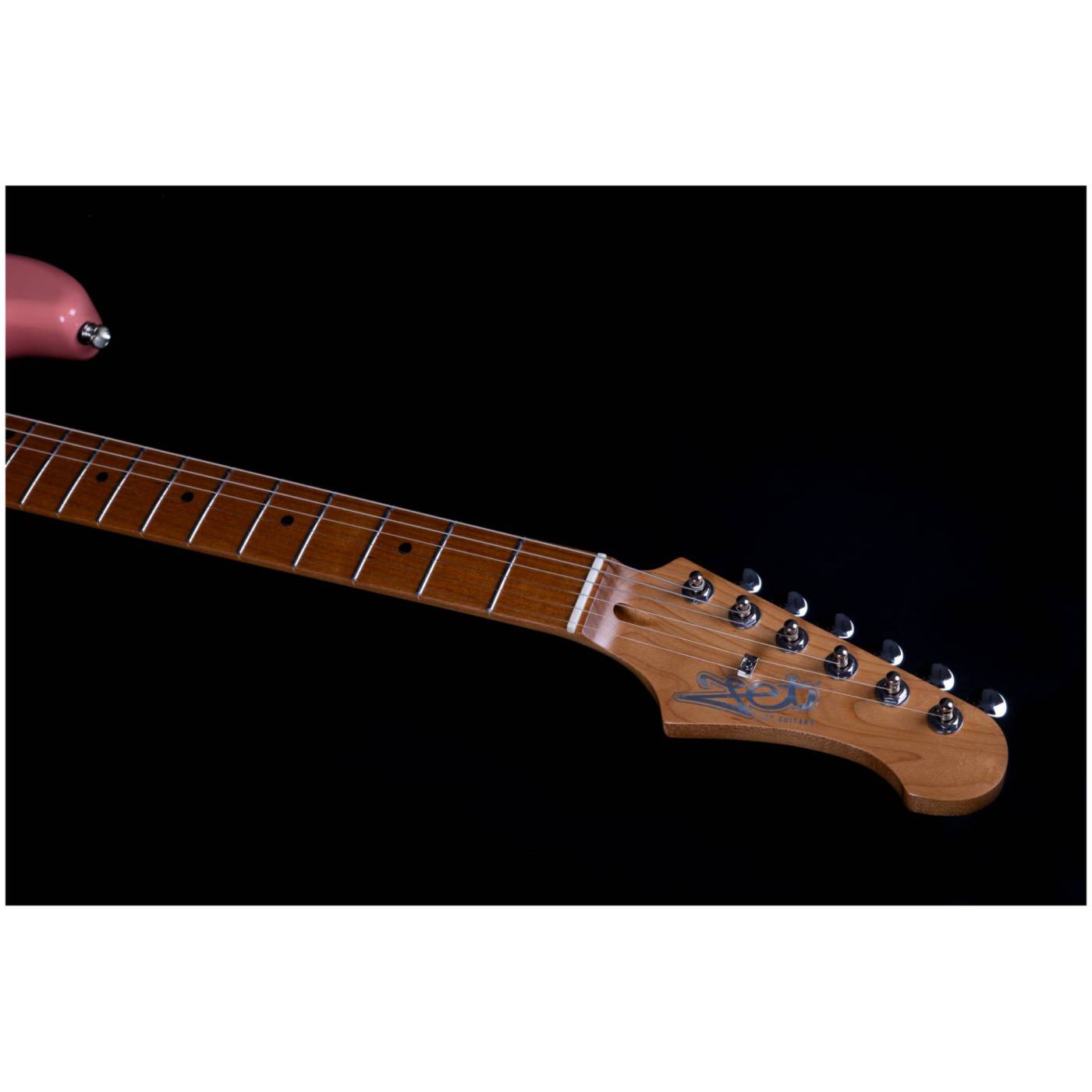 Гриф и накладка на гриф выполнены из печеного клена (roasted maple). При такой обработке поры дерева максимально сжимаются и в процессе использования вода уже не будет выходить, ваша накладка не сожмется и лады не повылазят вне зависимости от влажности и смены температуры. Плюс такое дерево выглядит очень красиво.