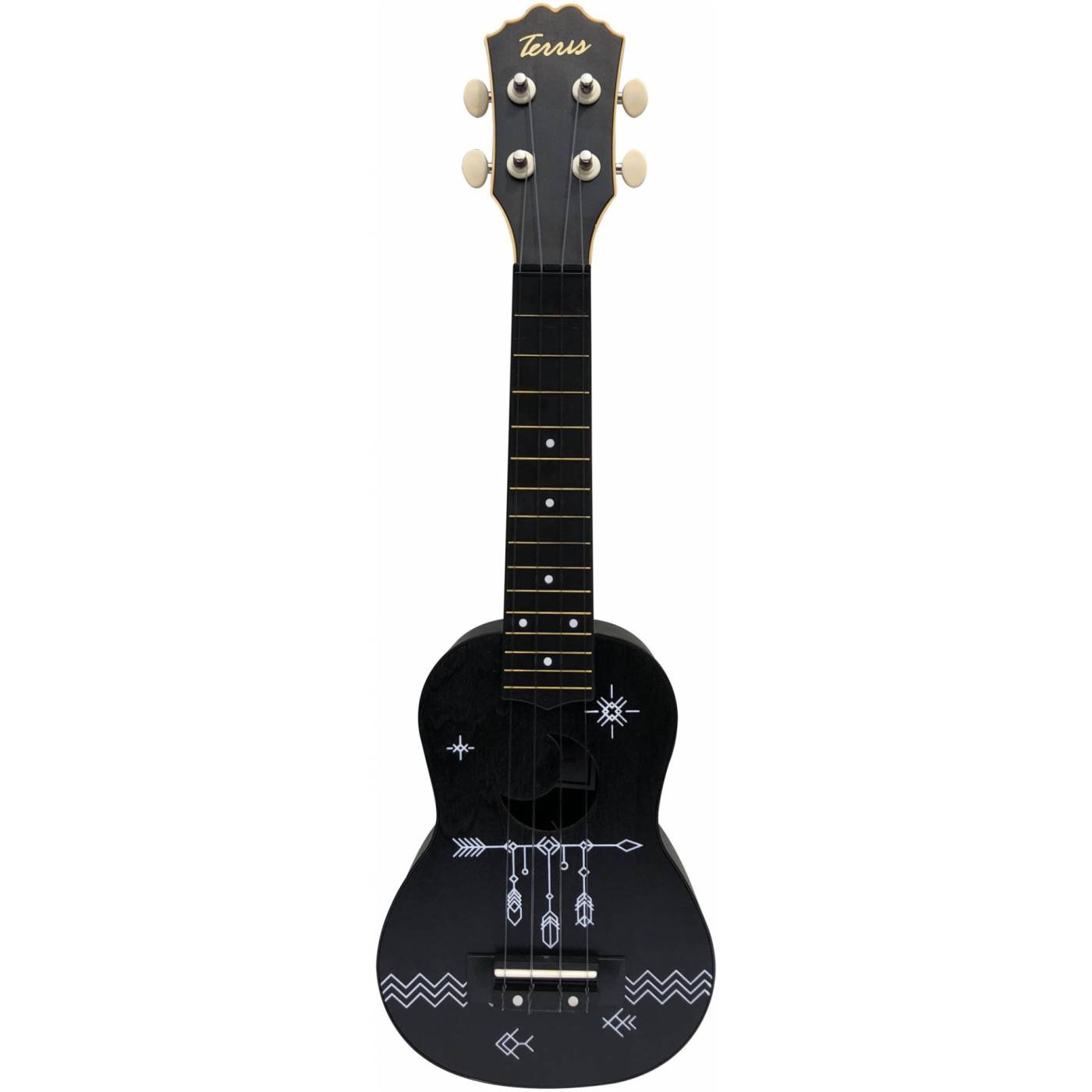 TERRIS PLUS SPIKE - укулеле черного цвета, на верхней деке которой изображены серебрянные стрелы, а резонаторное отверстие выполнено в форме месяца.