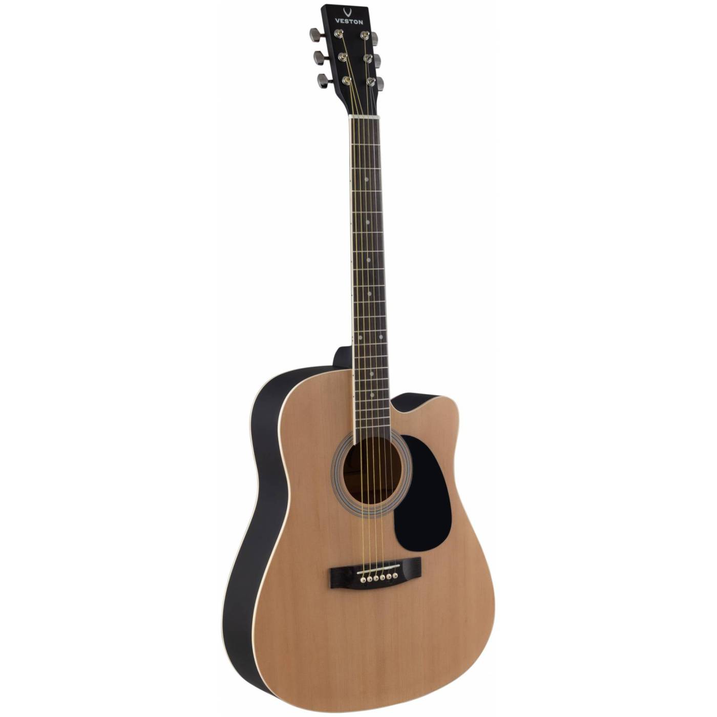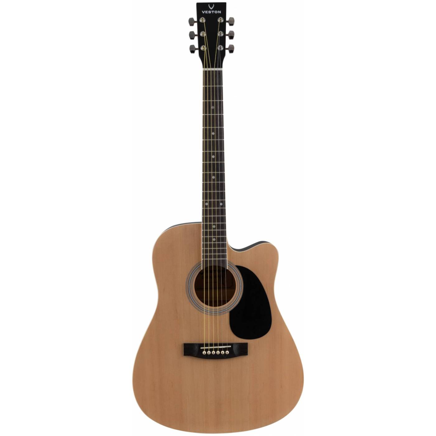 VESTON D-50C SP/N – акустическая гитара натурального цвета в корпусе дредноут с вырезрм. Особенность этой гитары в более широком грифе - 48 мм., у обычных гитар это, как правило, 43 мм.