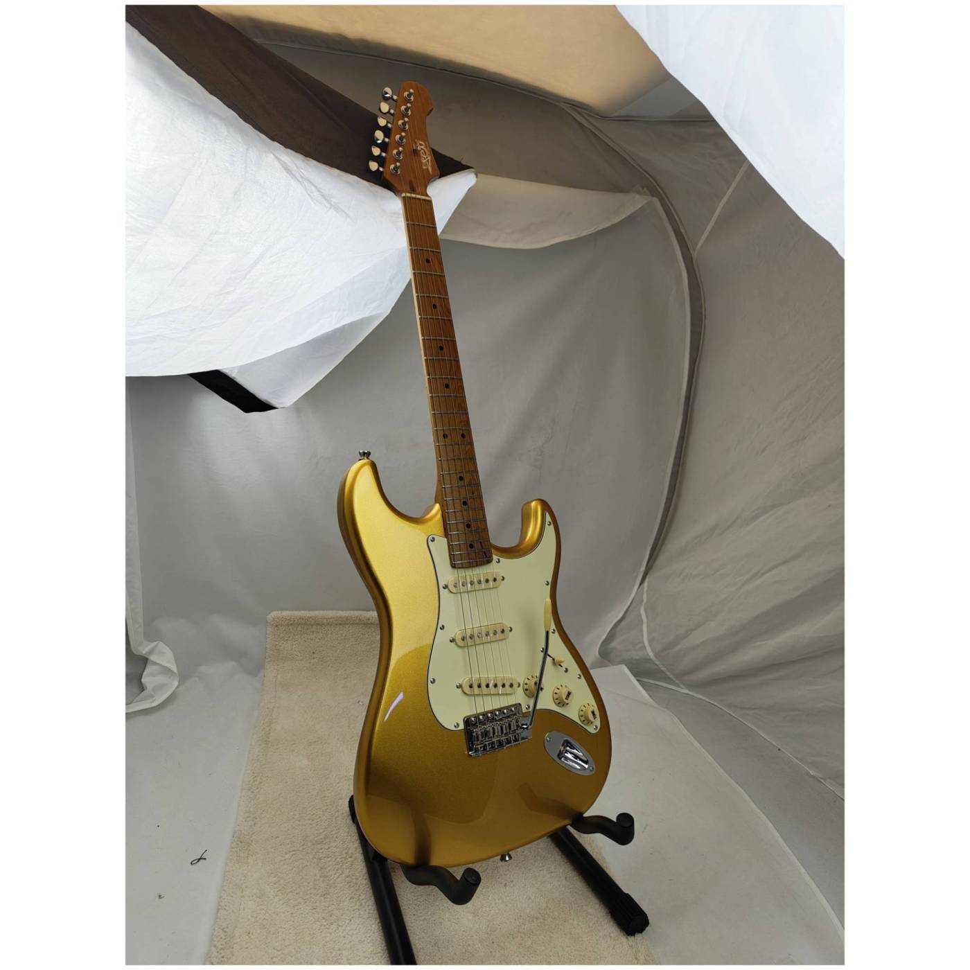 Гриф и накладка на гриф выполнены из печеного клена (roasted maple). При такой обработке поры дерева максимально сжимаются и в процессе использования вода уже не будет выходить, ваша накладка не сожмется и лады не повылазят вне зависимости от влажности и смены температуры. Плюс такое дерево выглядит очень красиво.