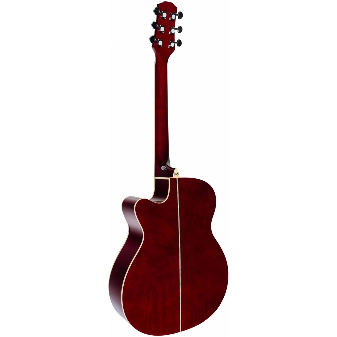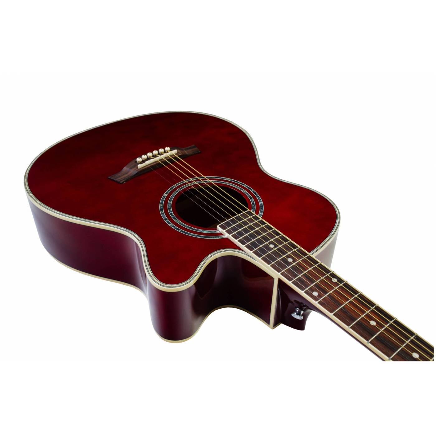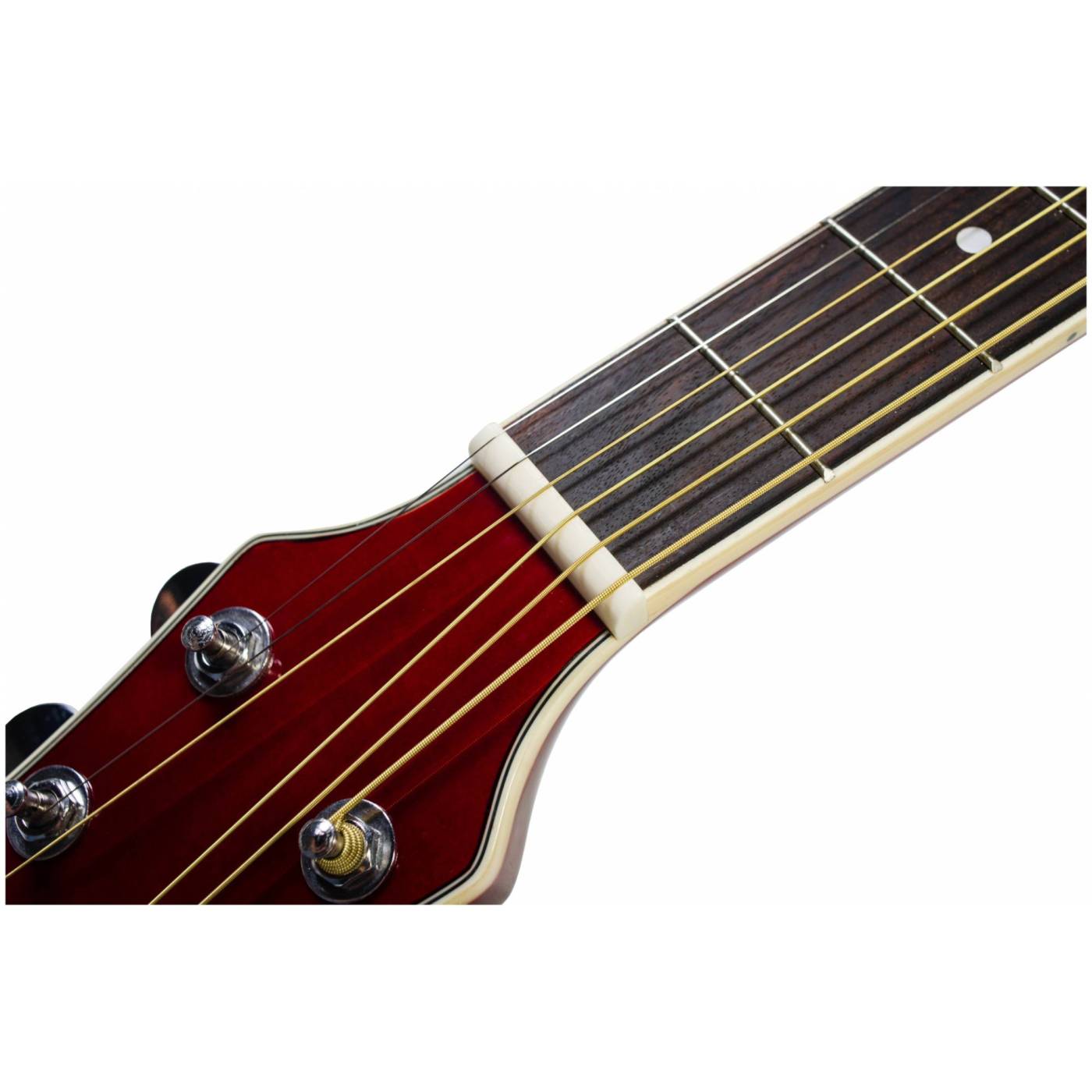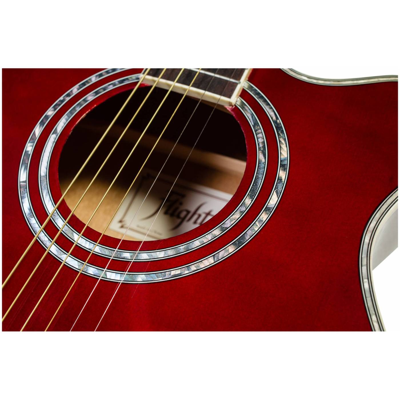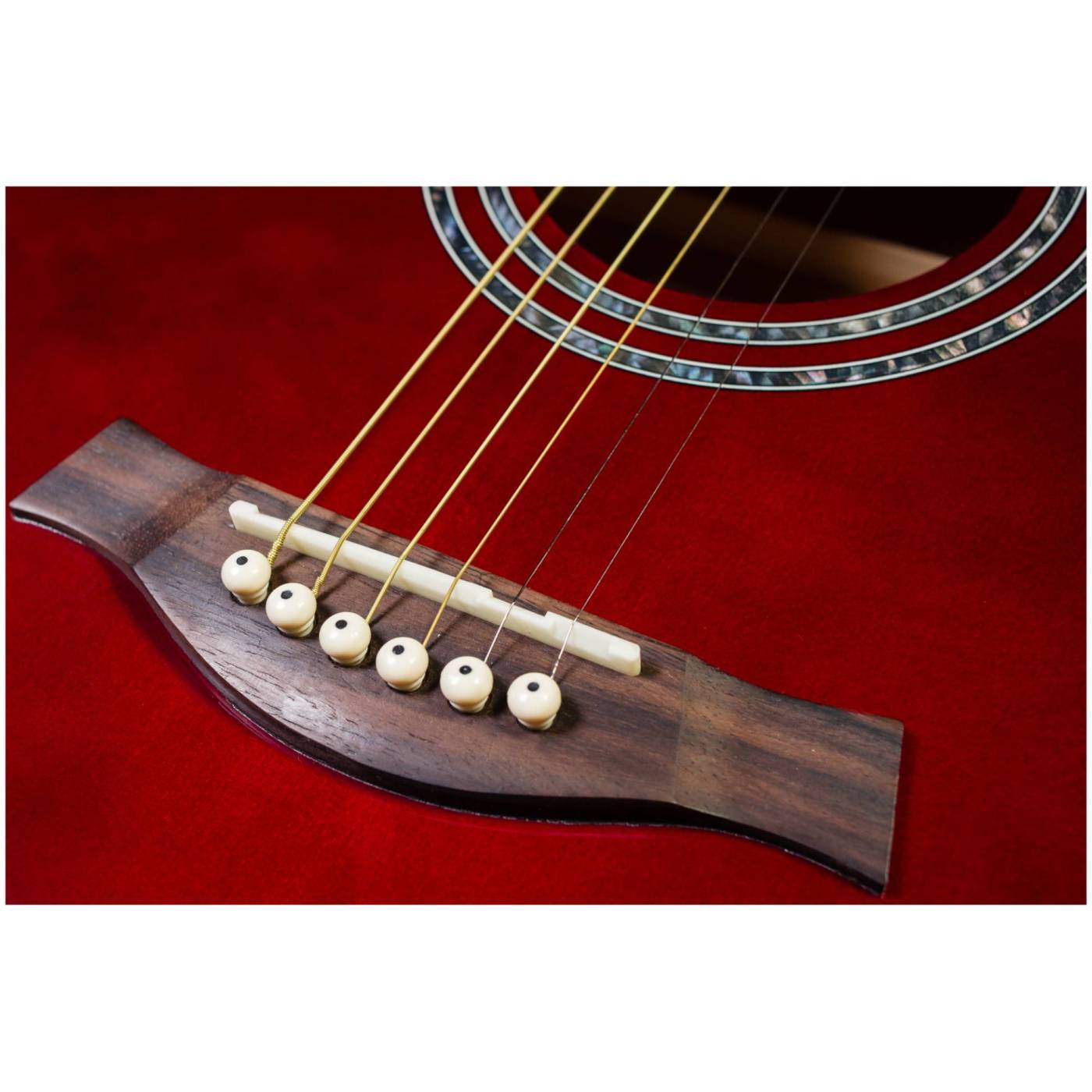 Двойное кольцо перламутрового цвета на розетке гармонично сочетается с перламутровой окантовкой на верхней деке. Инструмент выполнен в цвете red vine и глянцевой отделке.