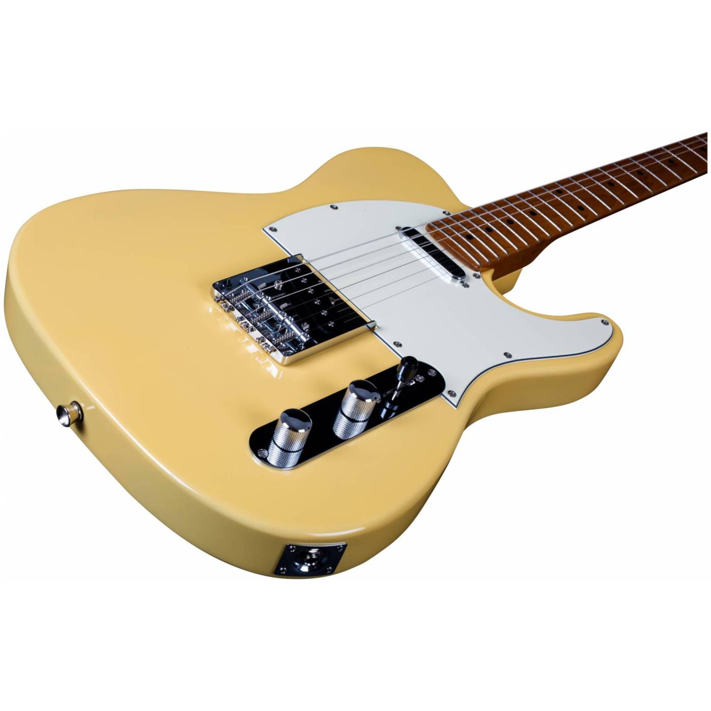 Гриф и накладка на гриф выполнены из печеного клена (roasted maple). При такой обработке поры дерева максимально сжимаются и в процессе использования вода уже не будет выходить, ваша накладка не сожмется и лады не повылазят вне зависимости от влажности и смены температуры. Плюс такое дерево выглядит очень красиво.