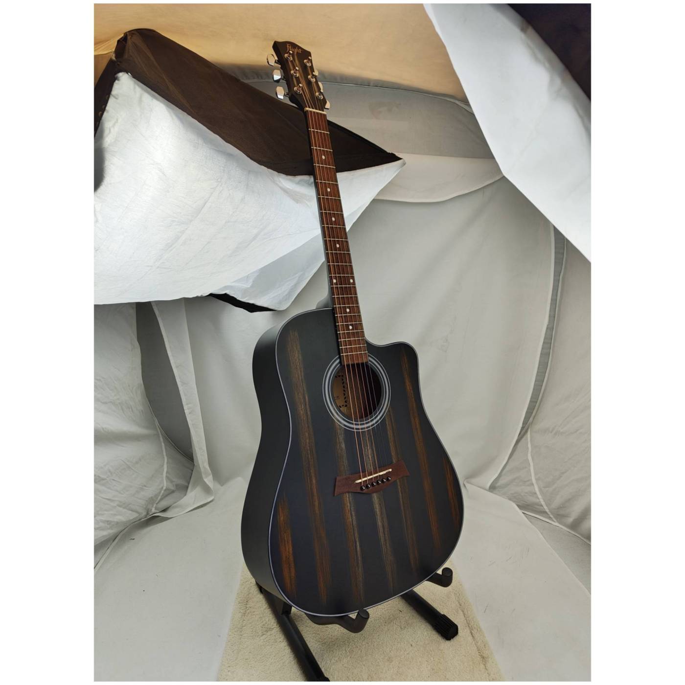 Гитара прозрачного черного цвета, покрытие - матовый лак.