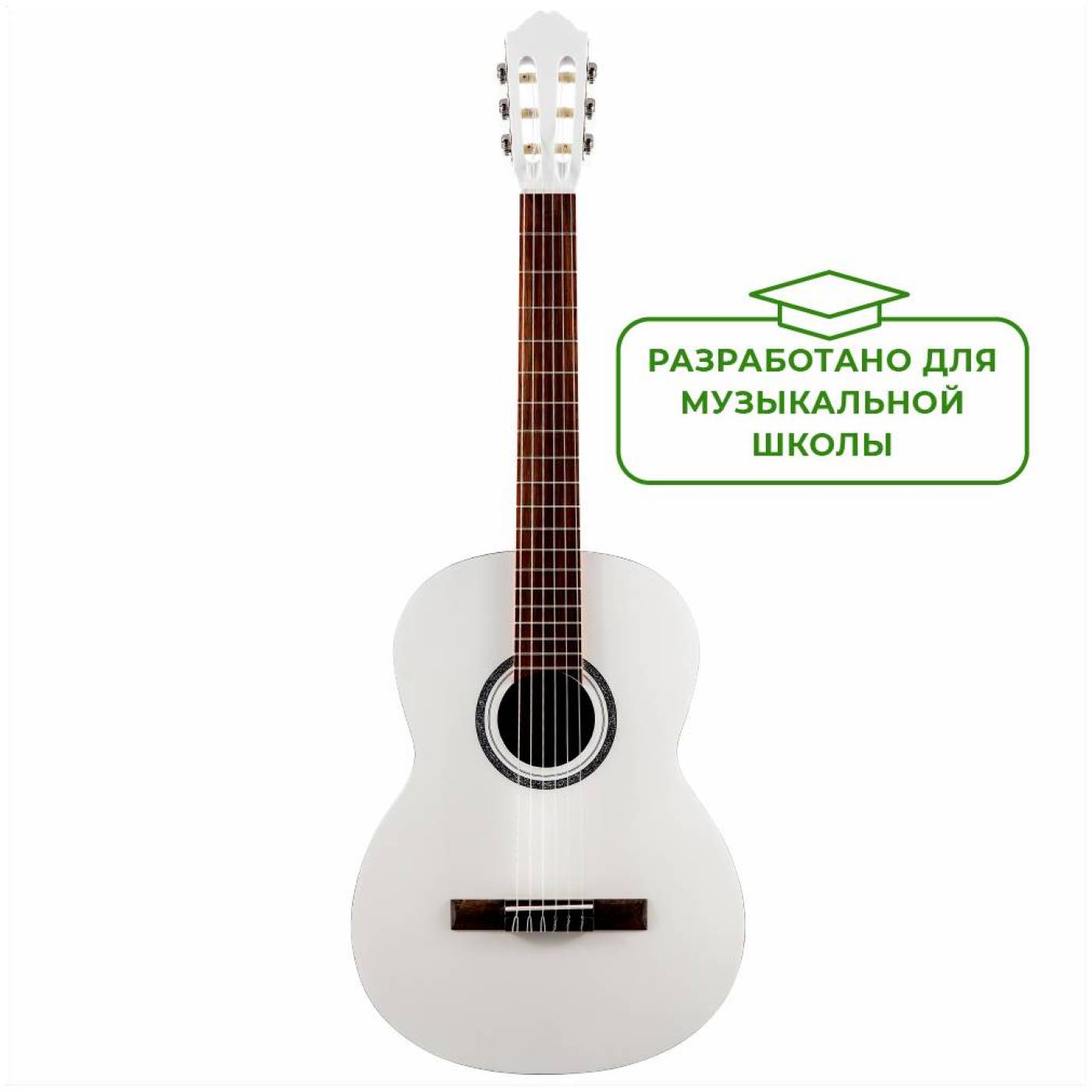 Полноразмерная 4/4 классическая гитара белого цвета с матовой отделкой.