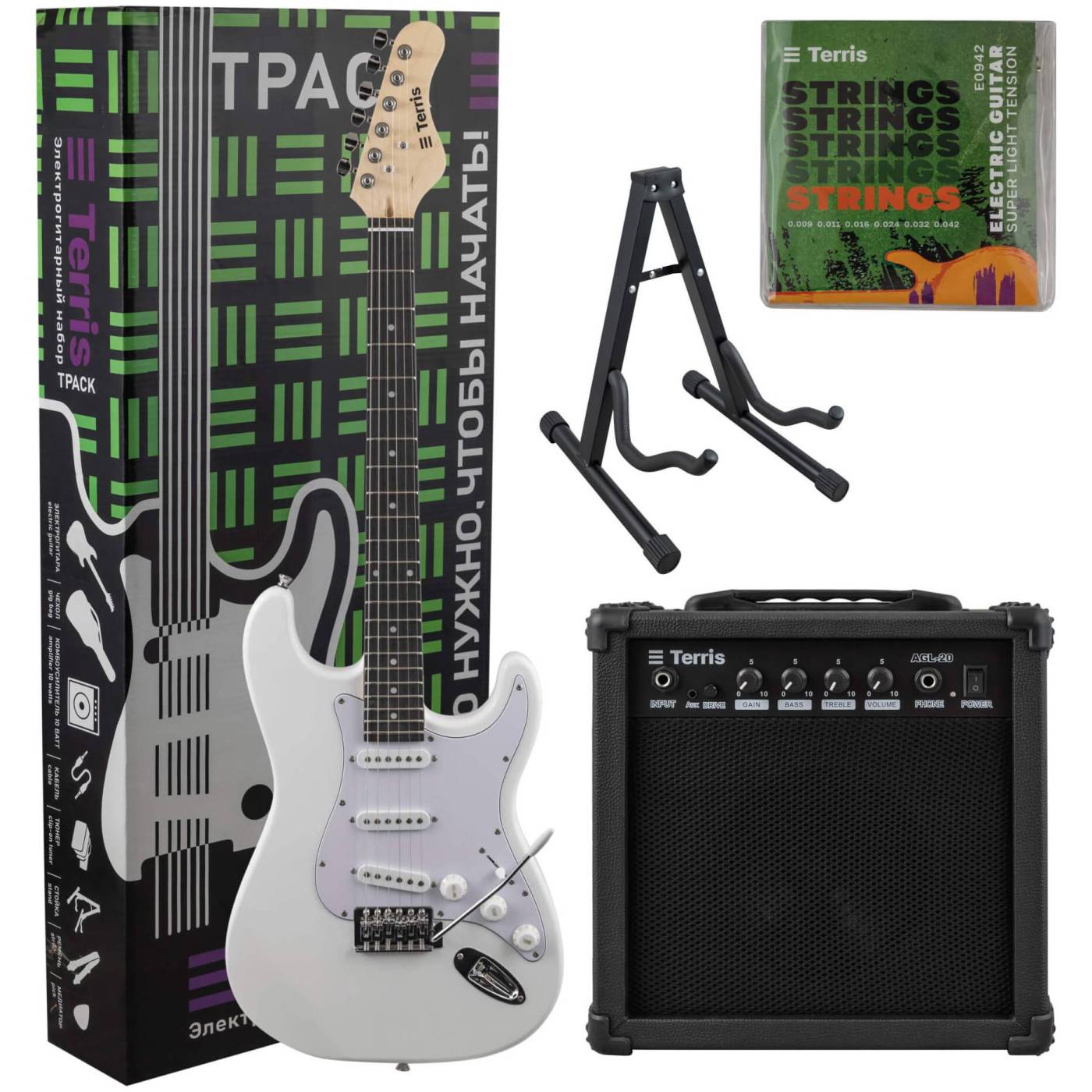 Обновленный электрогитарный набор – TERRIS TPACK-TST-040 WH, который включает в себя 9 предметов: