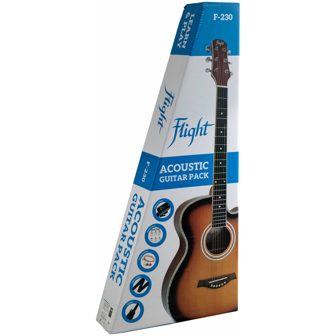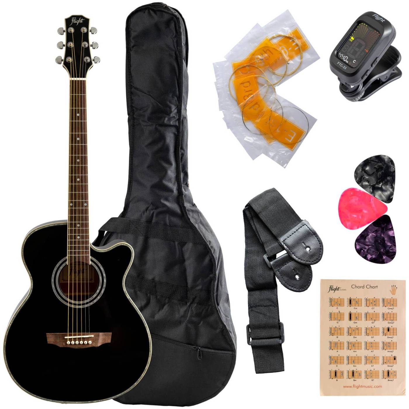 FLIGHT F-230 BLK PACK – это комплект с акустической гитарой черного цвета и набором необходимых аксессуаров.