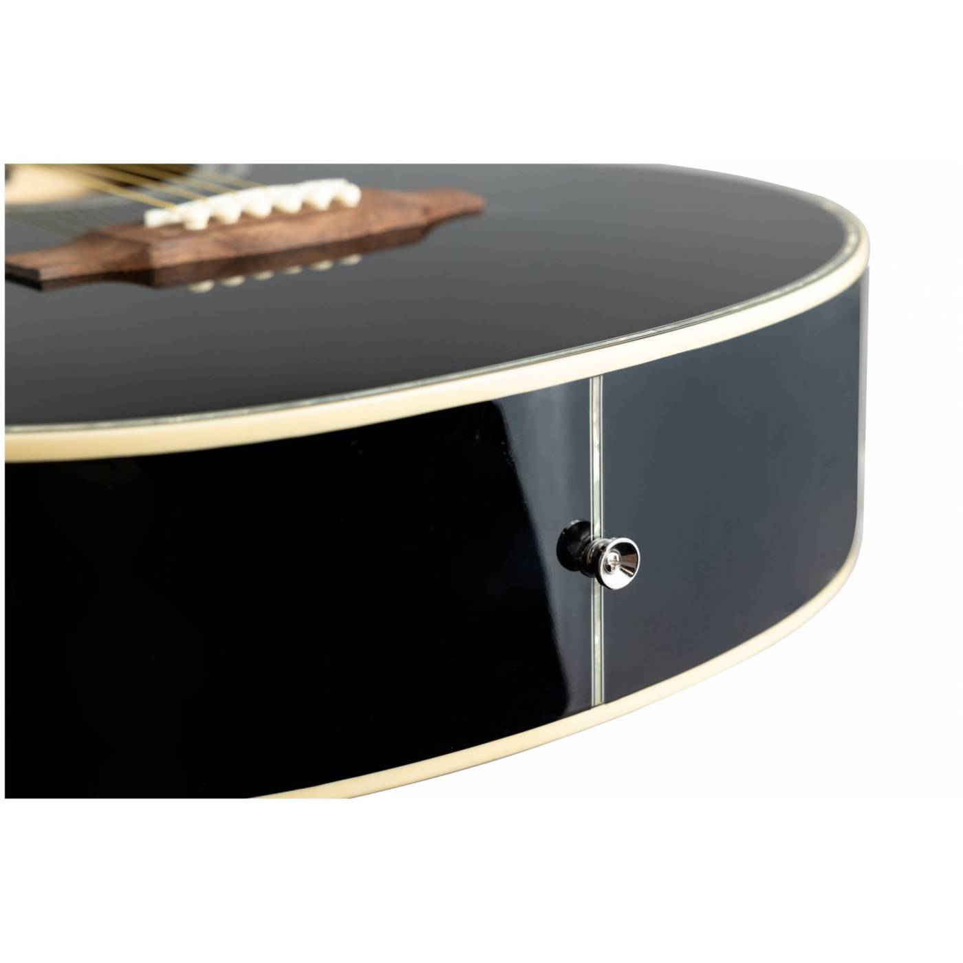 Двойное кольцо перламутрового цвета на розетке гармонично сочетается с перламутровой окантовкой на верхней деке. Инструмент выполнен в черном цвете и глянцевой отделке.