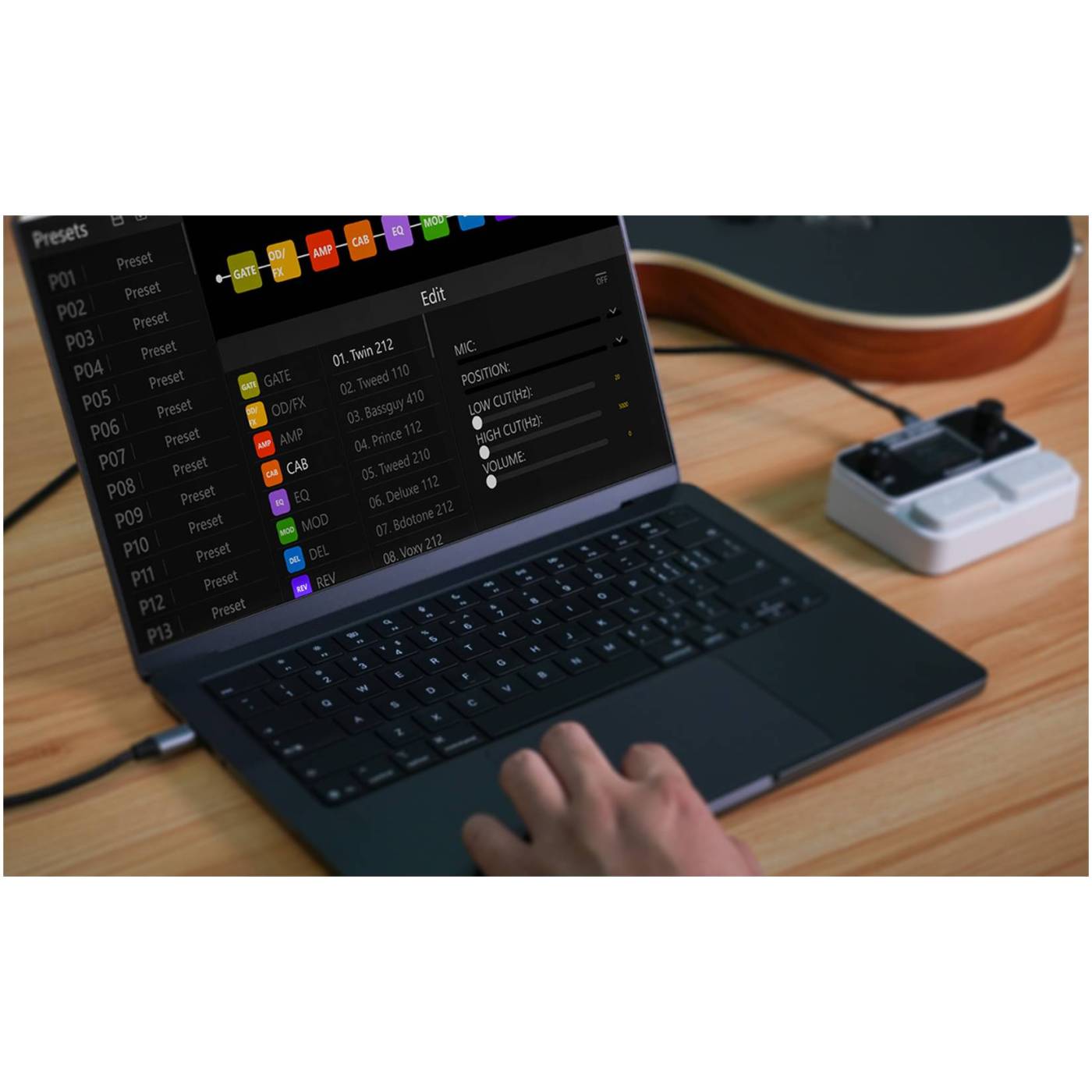 3. При подключении к усилителю гитары или бас-гитары установите Amp и Cab в режим обхода, чтобы избежать самовозбуждения.